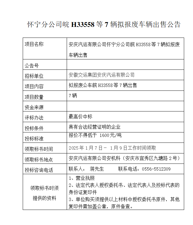 懷寧分公司皖H33558等7輛擬報廢車(chē)輛出售公告